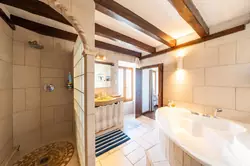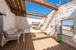 Upstairs, there's a spacious master suite with a walk-in wardrobe and a large bathroom featuring both a shower, bathtub, and toilet. The top floor offers a second bedroom with its own shower room and toilet, as well as access to a lovely rooftop terrace with stunning views of Saint-Paul-de-Vence and the sea.