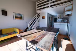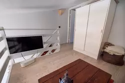 With a surface area of approximately 40 m² spread over two levels, the flat comprises an entrance hall, a bedroom, a bathroom, a toilet and a bright living room with an open-plan, fully equipped kitchen and dining area on the ground floor.