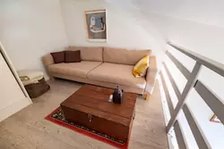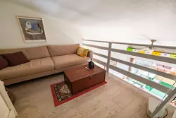 A staircase leads to the mezzanine, where there is a large air-conditioned bedroom and a cosy lounge. The flat is sold furnished.