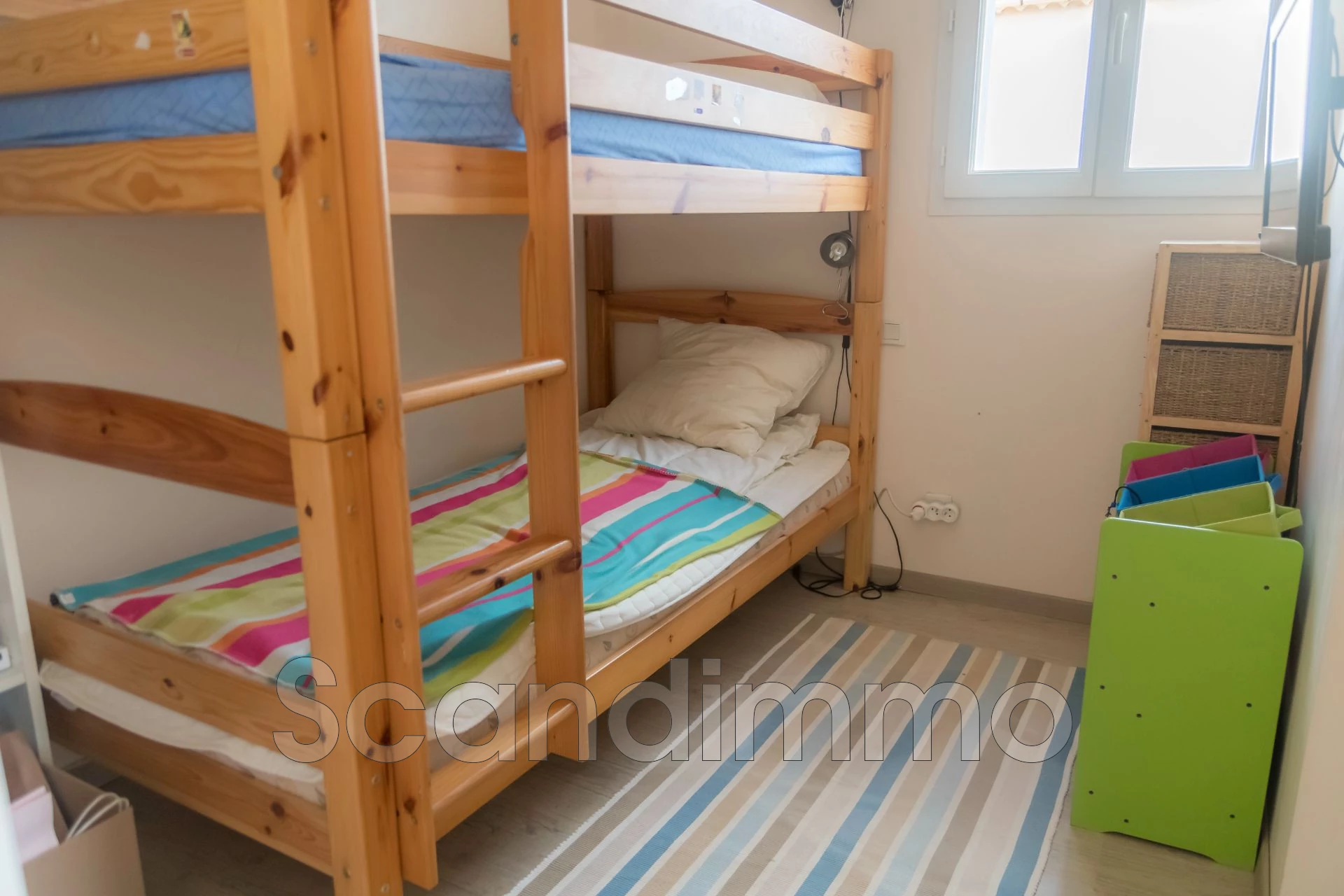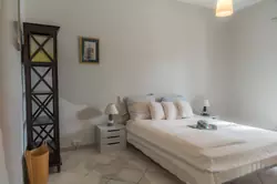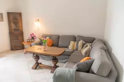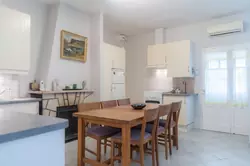 The apartment above the garage: Entrance hall/wardrobe, a large living room with open-plan kitchen and dining area, 2 double bedrooms with space for a double bed and 2 smaller bedrooms with bunk beds, shower room with toilet. From the kitchen there is access to a balcony with stairs down to the garden and pool. There is air conditioning in all rooms. In total, there are beds for 12 people.