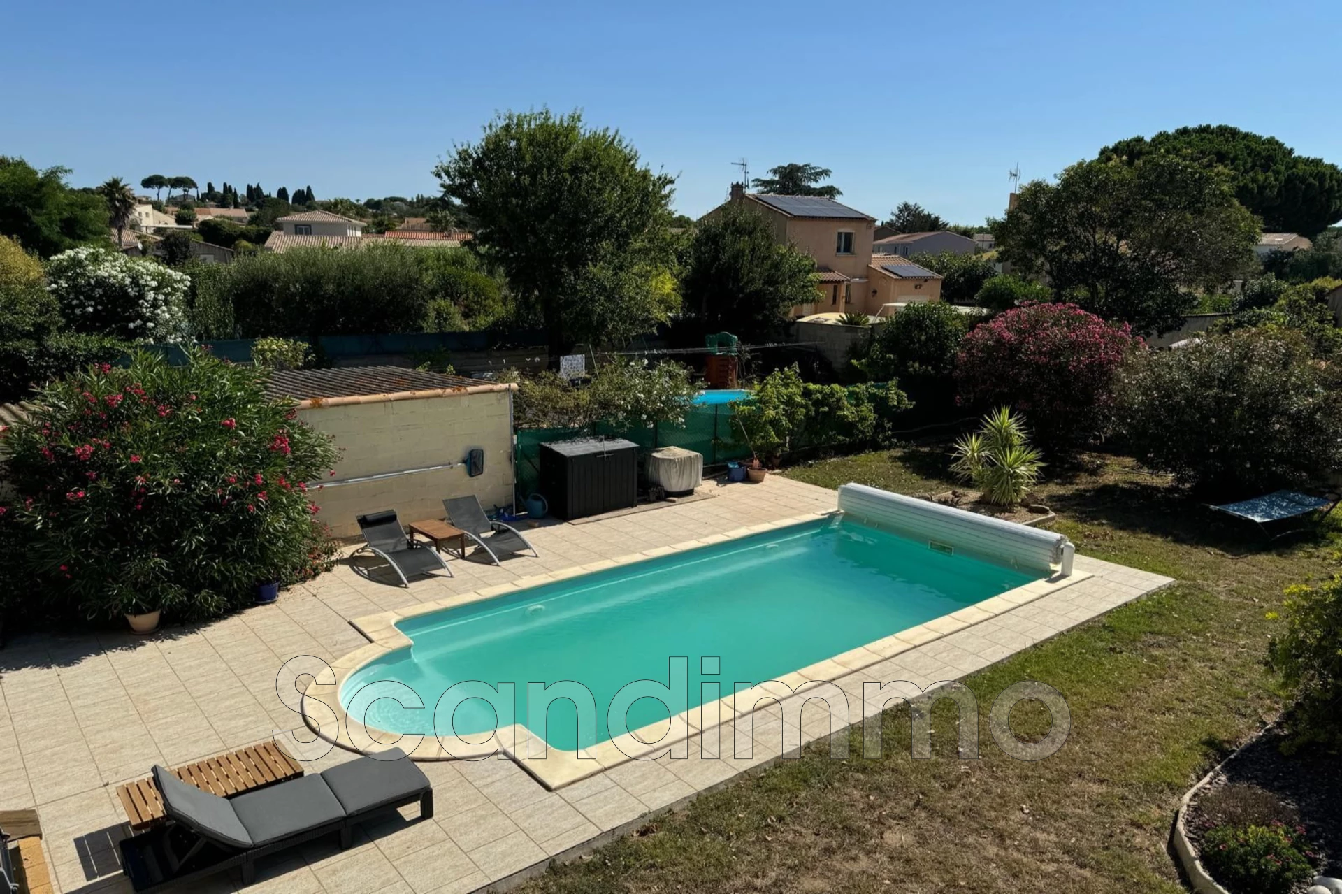 The garden, which is sheltered at the back of the house, also houses an inviting swimming pool.