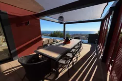 The light-filled living room opens onto a vast shaded terrace, seamlessly extending the living space outdoors. Adjoining this area is a fully equipped contemporary open-plan kitchen with a dining area—perfect for cooking, entertaining, and sharing special moments. Large sliding glass doors lead to the terrace and a stunning infinity pool, inviting relaxation and conviviality.