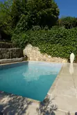 The garden is beautifully landscaped, and the owner has created several relaxation areas. A small swimming pool provides a refreshing dip in the summer.