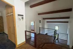 You enter into a large entrance and at this level, there is a bathroom with bathtub, sink and toilet. A few steps further down are 2 bedrooms, including the master bedroom, very large, having it's private shower room and toilet. The master bedroom offers a beautiful view of the exterior and the greenery. A few short steps further down is the third bedroom with a lovely view of the greenery and the countryside.